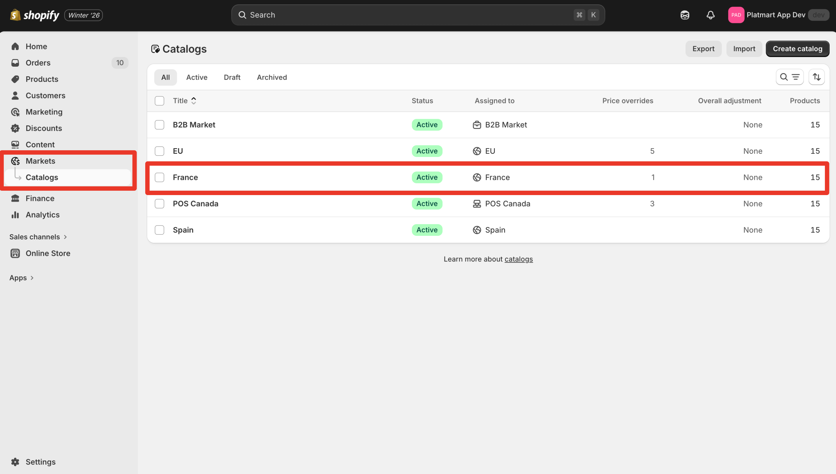 Once you've made market price changes you can preview new prices in the store or by opening Shopify > Markets > Catalogs, selecting the specific market and reviewing the Pricing and Products sections.