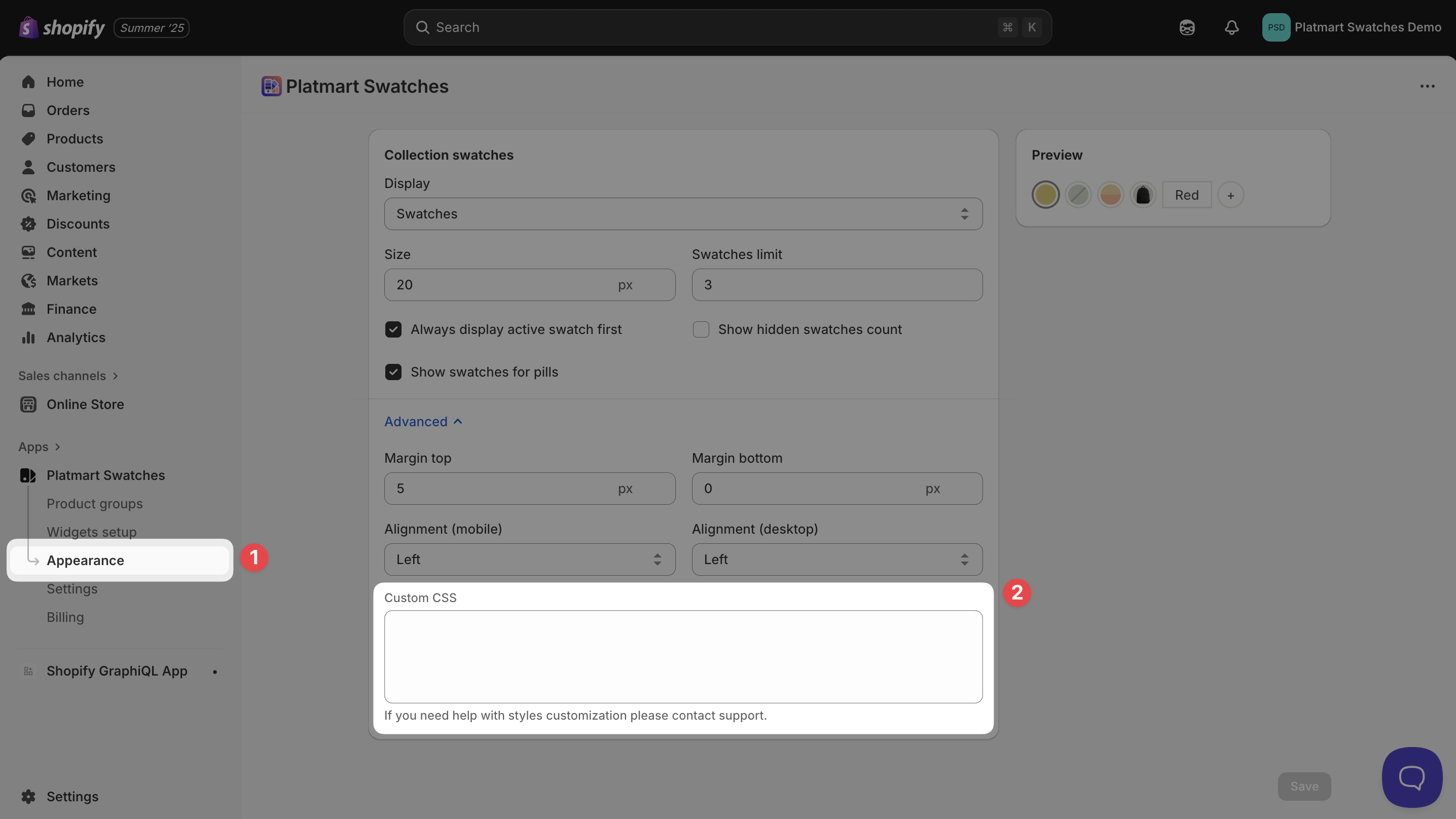 For more advanced customization you might access app metafields and implement your custom swatches widget in Liquid or in headless store.