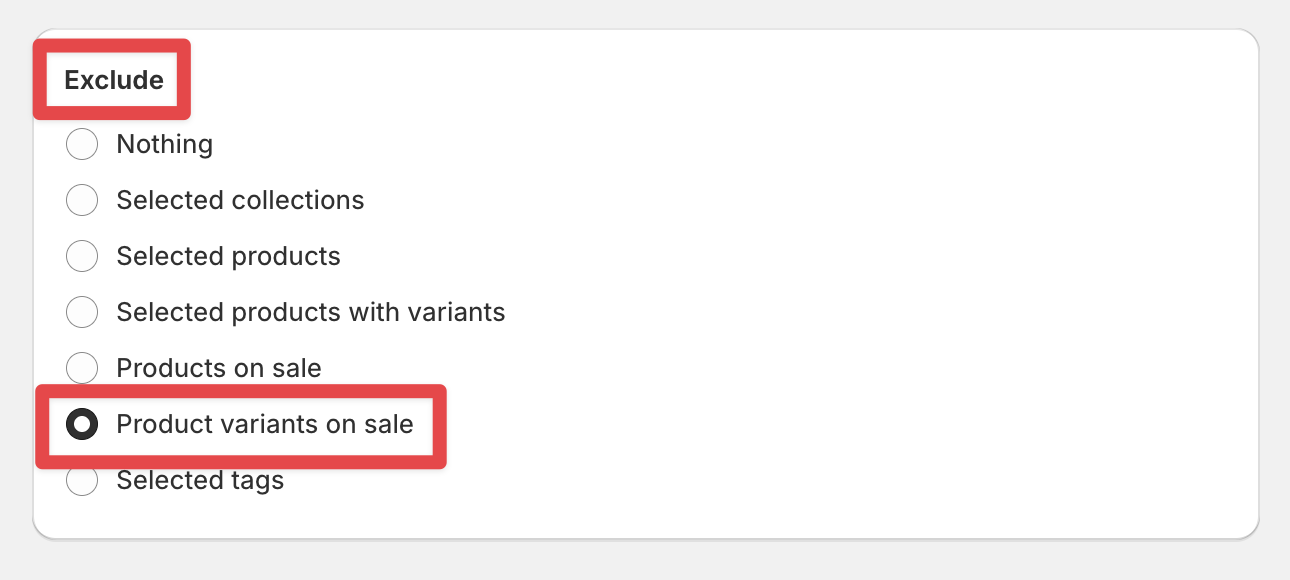 This will exclude any products that have at least one variant on sale. We detect existing discounts by checking the Compare at price field.